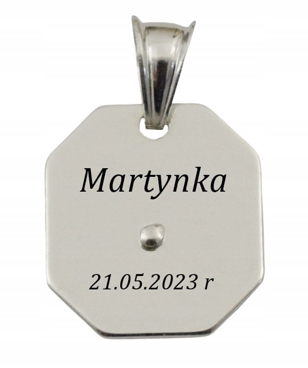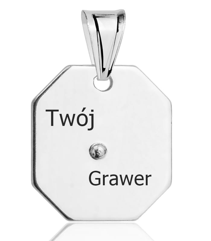 Na tylnej części zawieszki możemy wygrawerować każdy nadesłany przez Państwa tekst np. imię i nazwisko, data, grupa krwi itp. maksymalnie do 20 znaków