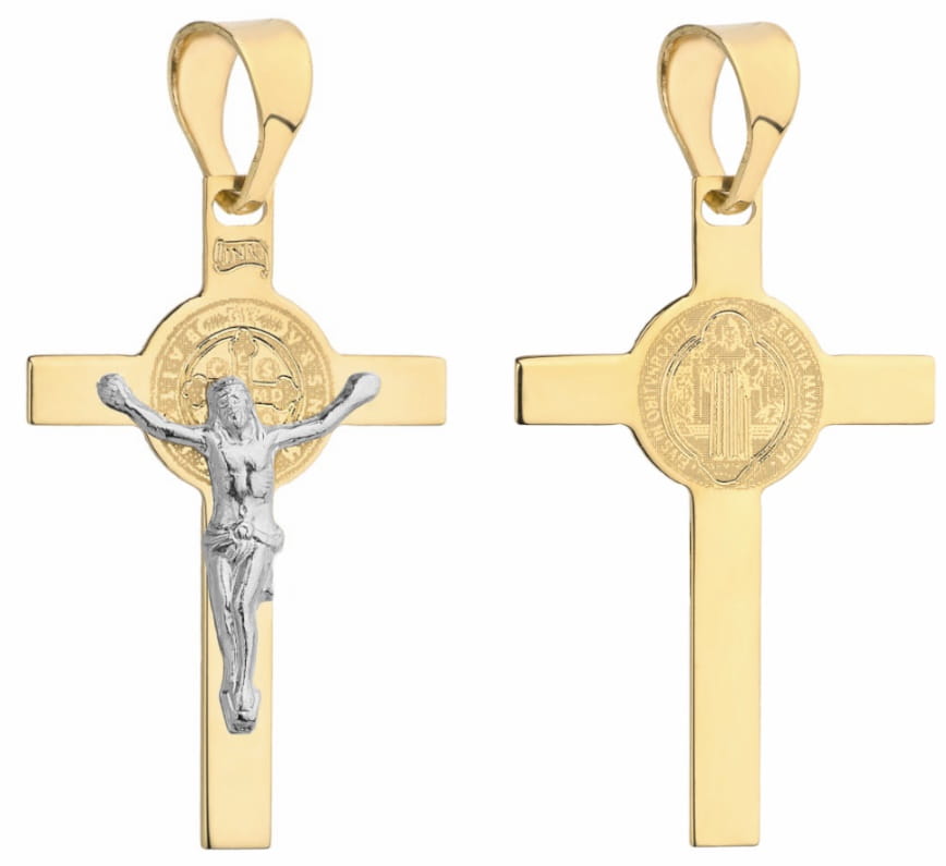 Złoty krzyżyk z medalionem św. Benedykta– wisiorek w kształcie krzyżyka stanowi przepiękną ozdobę o symbolice religijnej. Ma nieść za sobą liczne łaski i błogosławieństwa, w tym oddalać duchowe i fizyczne niebezpieczeństwa