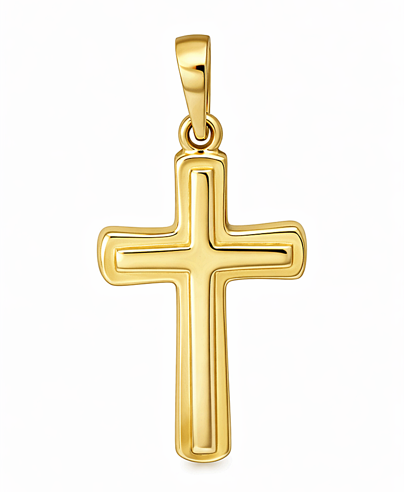 Ten elegancki złoty krzyżyk został wykonany z wysokiej jakości złota próby 585 (14 karatów). Jego klasyczny, ponadczasowy kształt oraz perfekcyjnie wypolerowana powierzchnia sprawiają, że pięknie odbija światło, podkreślając szlachetny blask żółtego złota.