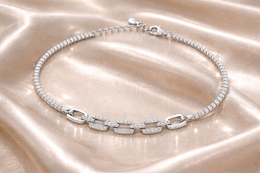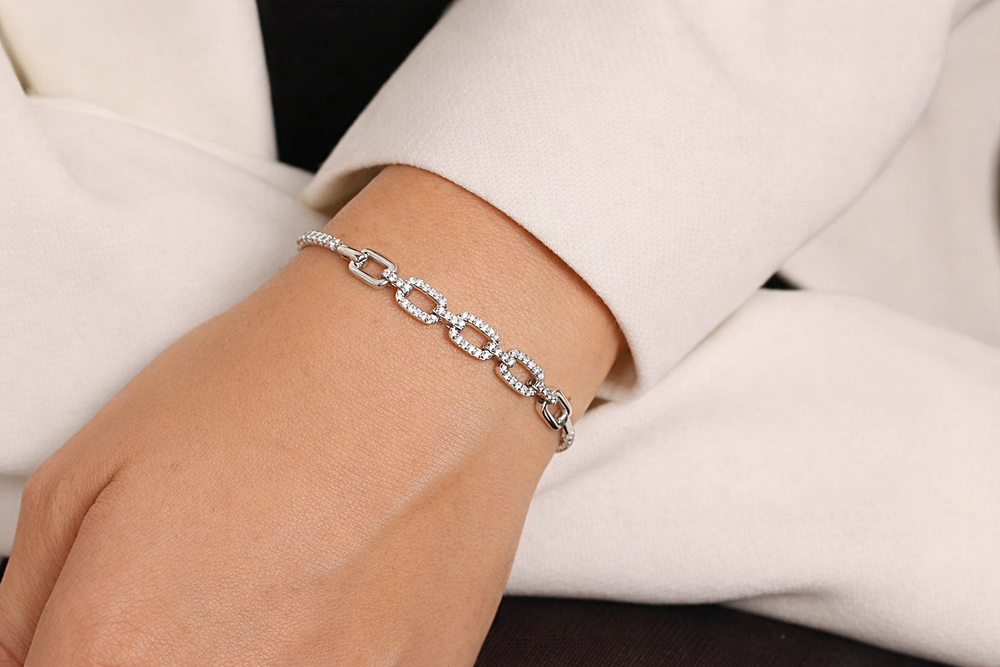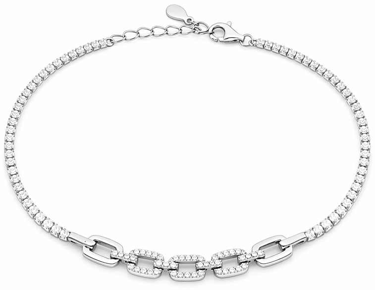 Wyjątkowa bransoletka wykonana z wysokiej jakości srebra próby 925 to połączenie klasyki z nowoczesnym designem. Delikatny łańcuszek typu tennis, ozdobiony lśniącymi cyrkoniami, harmonijnie łączy się z efektownymi, większymi ogniwami wysadzanymi drobnymi kamieniami, tworząc spójną i niezwykle elegancką kompozycję.