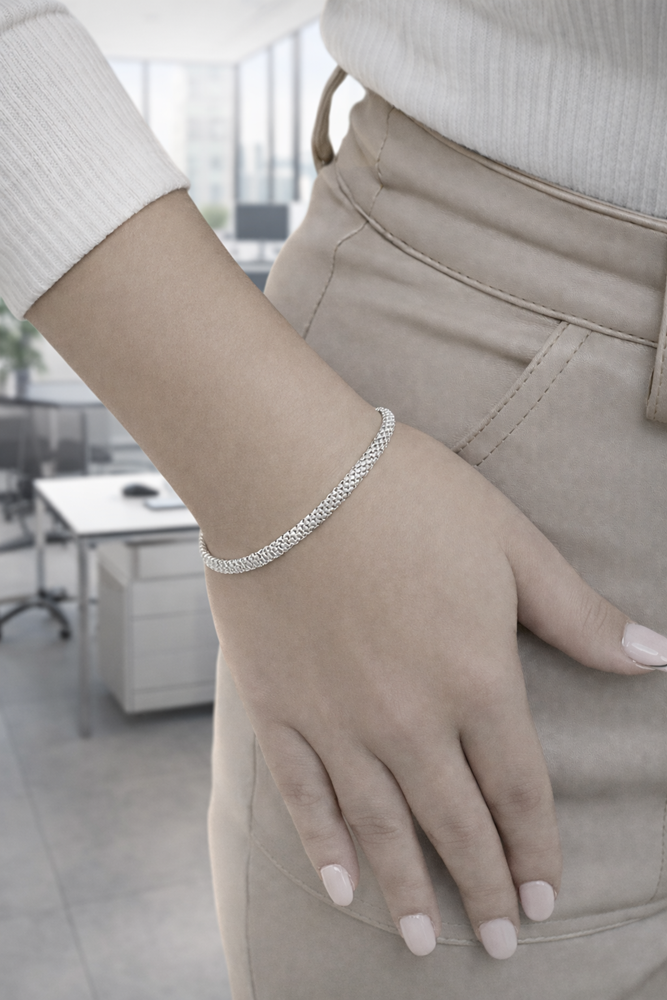 Ta wyjątkowa bransoletka została wykonana z najwyższej jakości srebra próby 925, co gwarantuje jej piękny połysk, odporność na matowienie i długowieczność. Splot typu tuba / siatka nadaje jej niepowtarzalny charakter – łączy w sobie klasyczną formę z nowoczesnym designem.