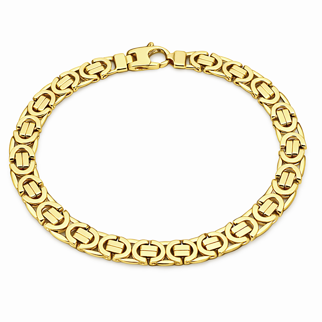 Elegancka i wyrazista złota bransoleta wykonana z wysokiej jakości złota próby 585 (14K). Model o pełnym, masywnym splocie zachwyca precyzją wykonania oraz ponadczasowym designem inspirowanym klasycznym wzornictwem królewskim. Starannie wyprofilowane ogniwa tworzą spójną, solidną całość, która pięknie układa się na nadgarstku i efektownie odbija światło.