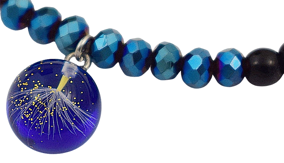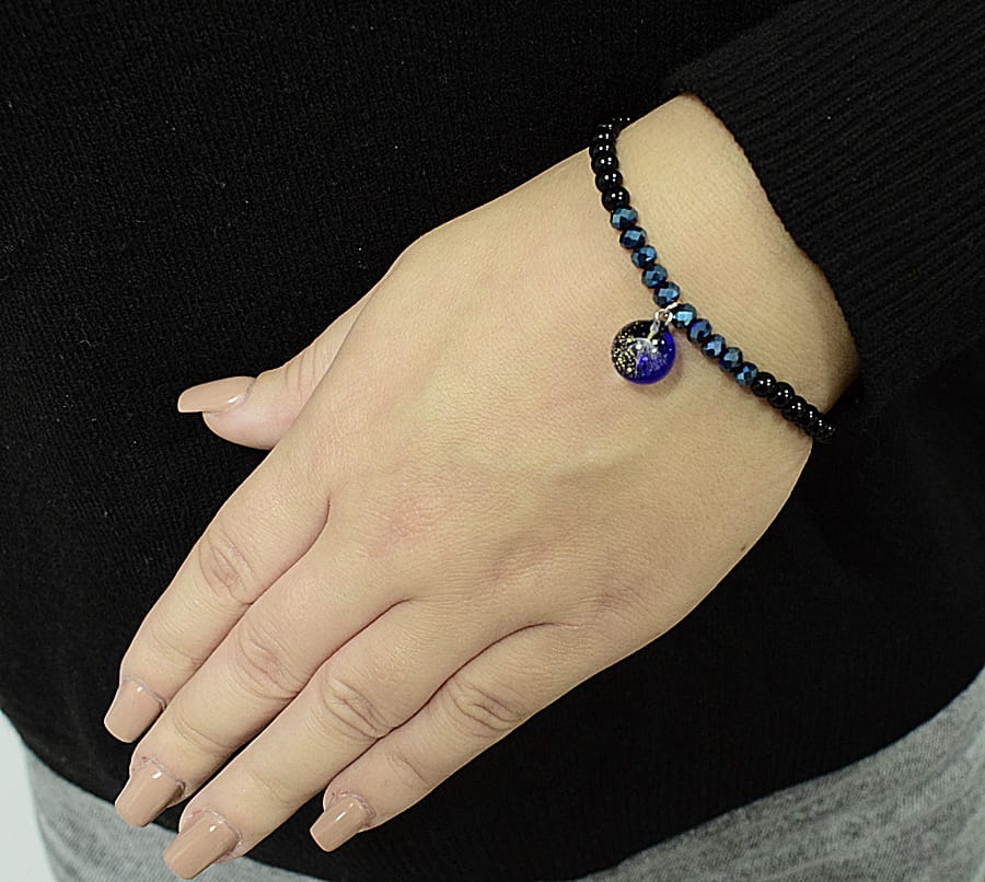 Modna koralikowa bransoletka ozdobiona efektowną zawieszką z żywicy w której na zawsze zatopione płatki złota z drobinkami węgla. Możesz stworzyć własny komplet biżuterii z innymi produktami z tej serii. Autorska biżuteria to idealny prezent dla ukochanej i bliskiej osoby.