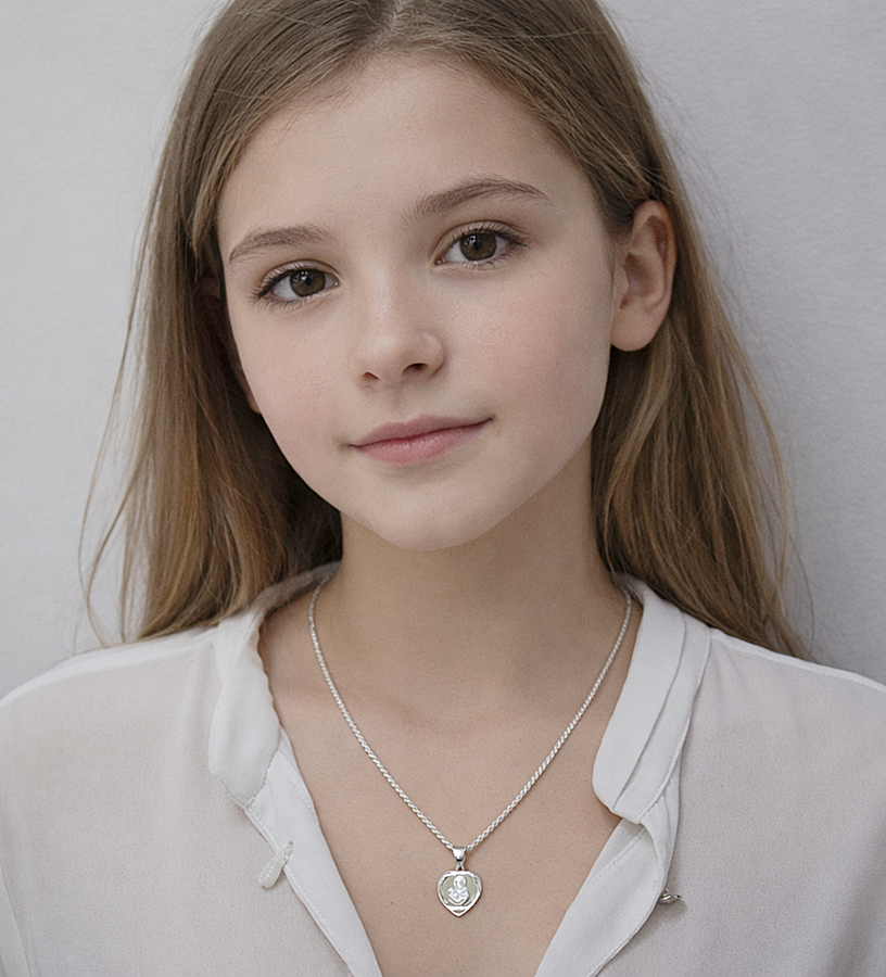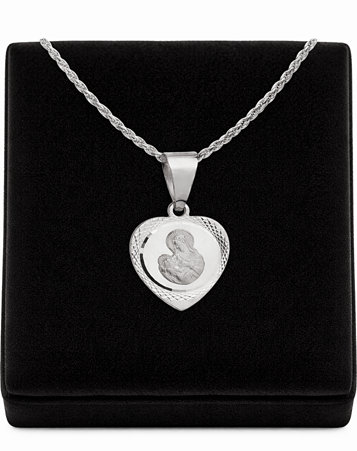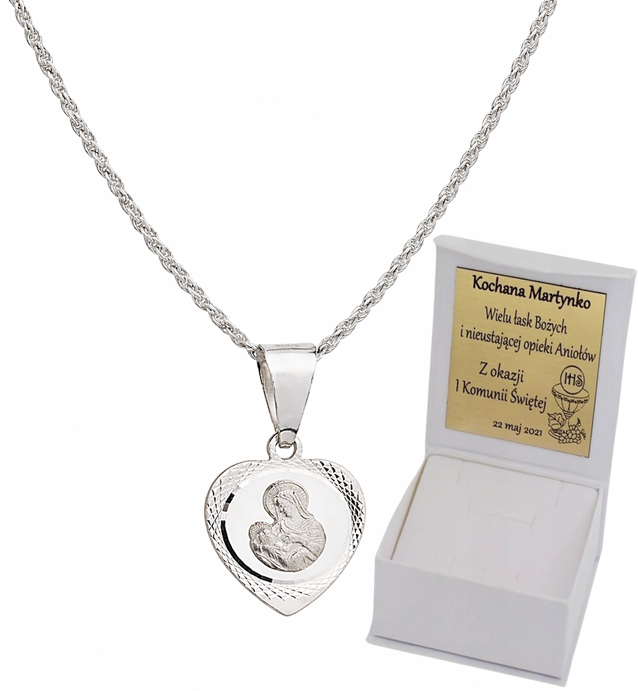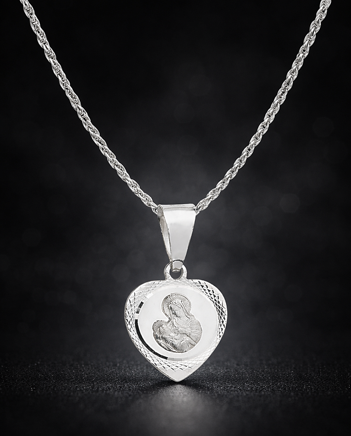 Wyjątkowy srebrny łańcuszek typu corda wykonany z najwyższej jakości srebra próby 925, ozdobiony eleganckim medalikiem w kształcie serca z wizerunkiem Matki Boskiej z Dzieciątkiem. Klasyczny, ponadczasowy wzór łączy w sobie subtelność z duchowym znaczeniem, tworząc piękną i symboliczną biżuterię na co dzień oraz na wyjątkowe okazje.