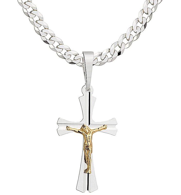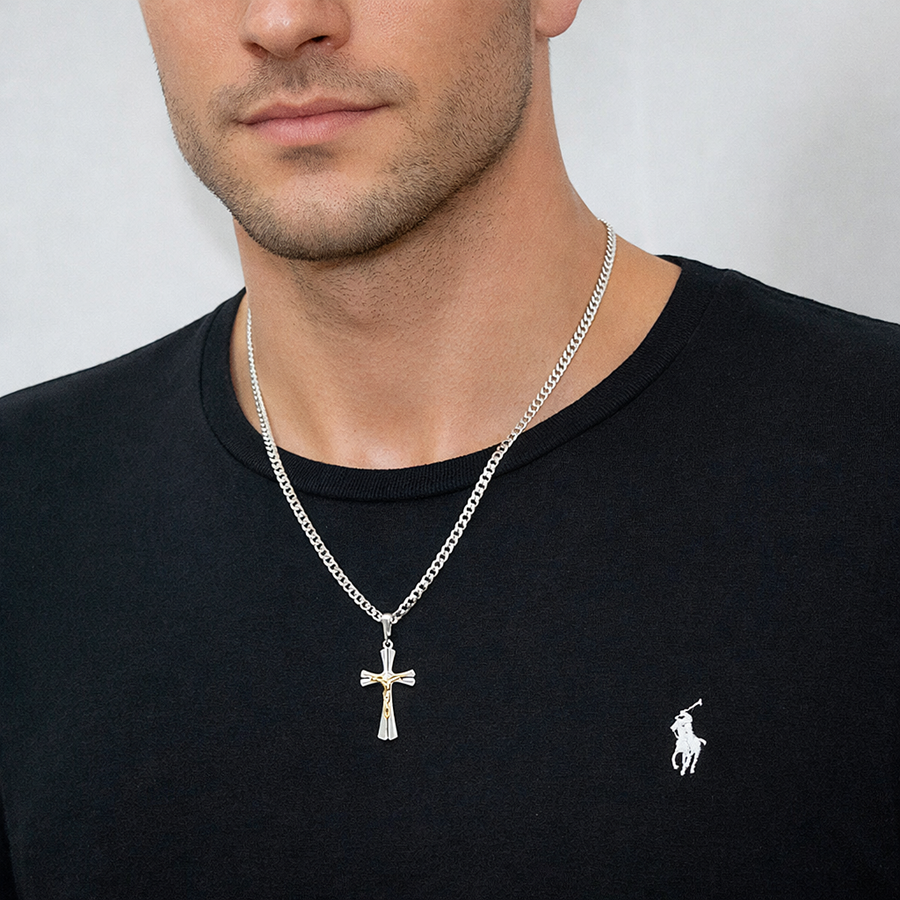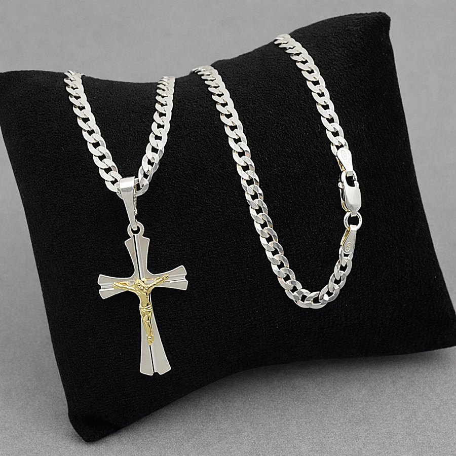 Elegancki i ponadczasowy komplet wykonany z najwyższej jakości srebra próby 925, idealny zarówno na co dzień, jak i na wyjątkowe okazje. Precyzyjne diamentowane wykończenie nadaje biżuterii intensywny blask i luksusowy charakter, a złocona pasyjka pięknie kontrastuje ze srebrem, podkreślając detale krzyżyka.