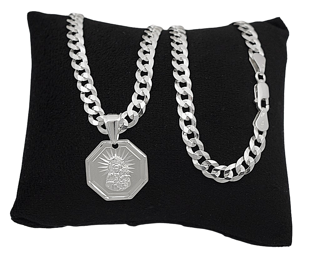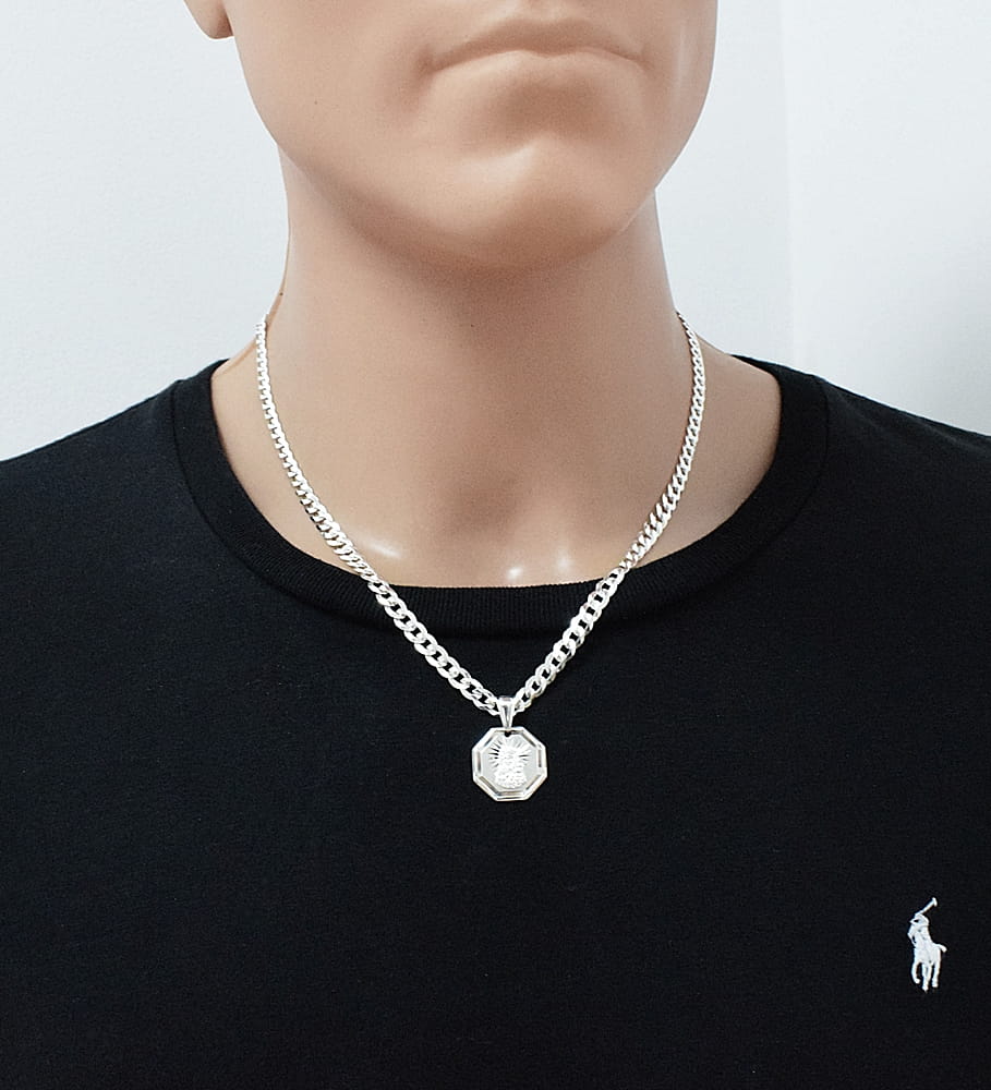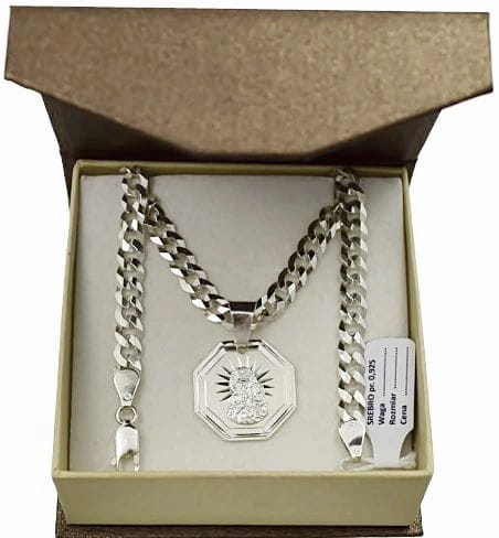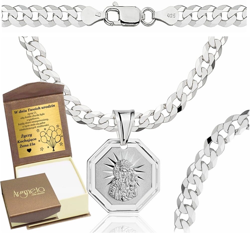 Elegancki i solidny srebrny łańcuszek wykonany z najwyższej jakości srebra próby 925. Klasyczny, ponadczasowy wzór typu pancerka w połączeniu z medalikiem o ośmiokątnym kształcie, przedstawiającym wizerunek Matki Boskiej z Dzieciątkiem, tworzy wyjątkowy i stylowy dodatek zarówno dla mężczyzn, jak i kobiet.