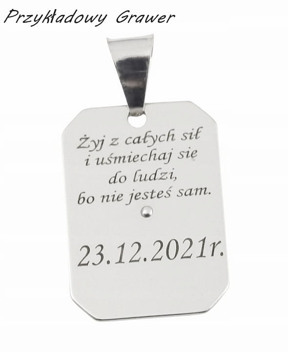 Na tylnej części zawieszki możemy wygrawerować każdy nadesłany przez Państwa tekst np. imię i nazwisko, data, grupa krwi itp. maksymalnie do 30 znaków