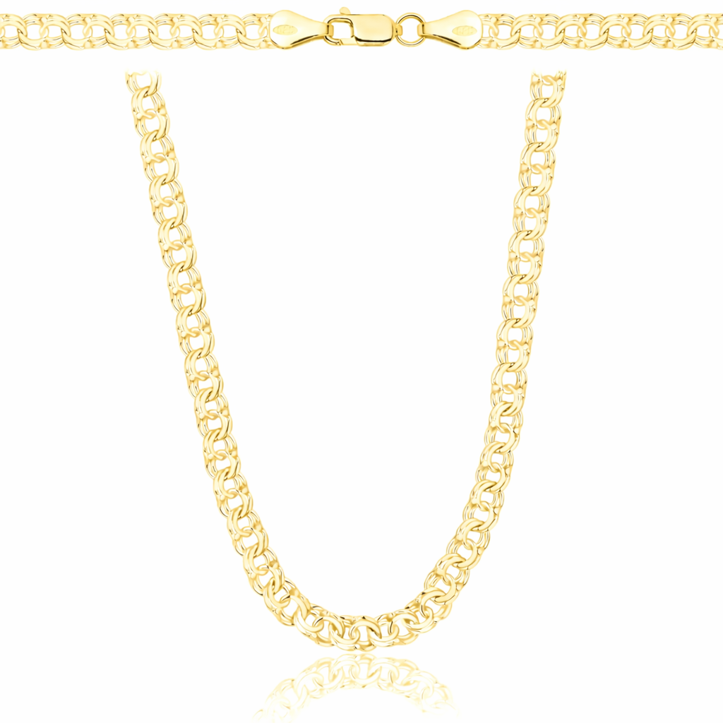 Elegancki damski łańcuszek wykonany ze srebra próby 925, pokryty warstwą złota, dzięki czemu zachwyca luksusowym wyglądem i trwałym połyskiem. Model o charakterystycznym splocie Garibaldi (Garibaldka) wyróżnia się podwójnym, gęsto połączonym układem ogniw, który nadaje łańcuszkowi wyjątkowej wyrazistości i eleganckiego charakteru. Ten klasyczny splot tworzy efekt pełniejszej, bardziej masywnej struktury, dzięki czemu biżuteria prezentuje się niezwykle stylowo i luksusowo, a jednocześnie zachowuje elegancką lekkość na szyi.