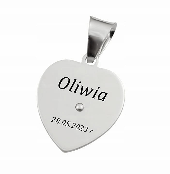 Na tylnej części zawieszki możemy wygrawerować każdy nadesłany przez Państwa tekst np. imię i nazwisko, data, grupa krwi itp. maksymalnie do 20 znaków