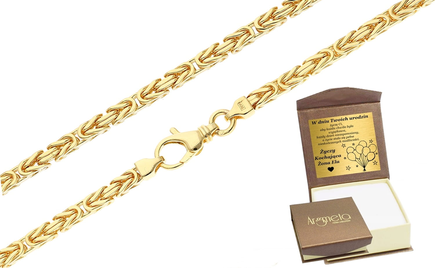 Łańcuszek został wykonany z pełnego złota próby 585 (14k) w ponadczasowym splocie królewskim. Charakteryzuje się solidnością, trwałością oraz wyjątkowym blaskiem, który przyciąga spojrzenia.