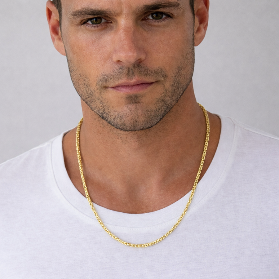 Podkreśl swoją wyjątkowość luksusowym złotym łańcuszkiem w splocie królewskim (byzantine), który od lat uznawany jest za jeden z najbardziej prestiżowych i efektownych wzorów jubilerskich. Perfekcyjnie wykonany ze złota próby 585, zachwyca blaskiem, trwałością i elegancją, która nigdy nie wychodzi z mody.