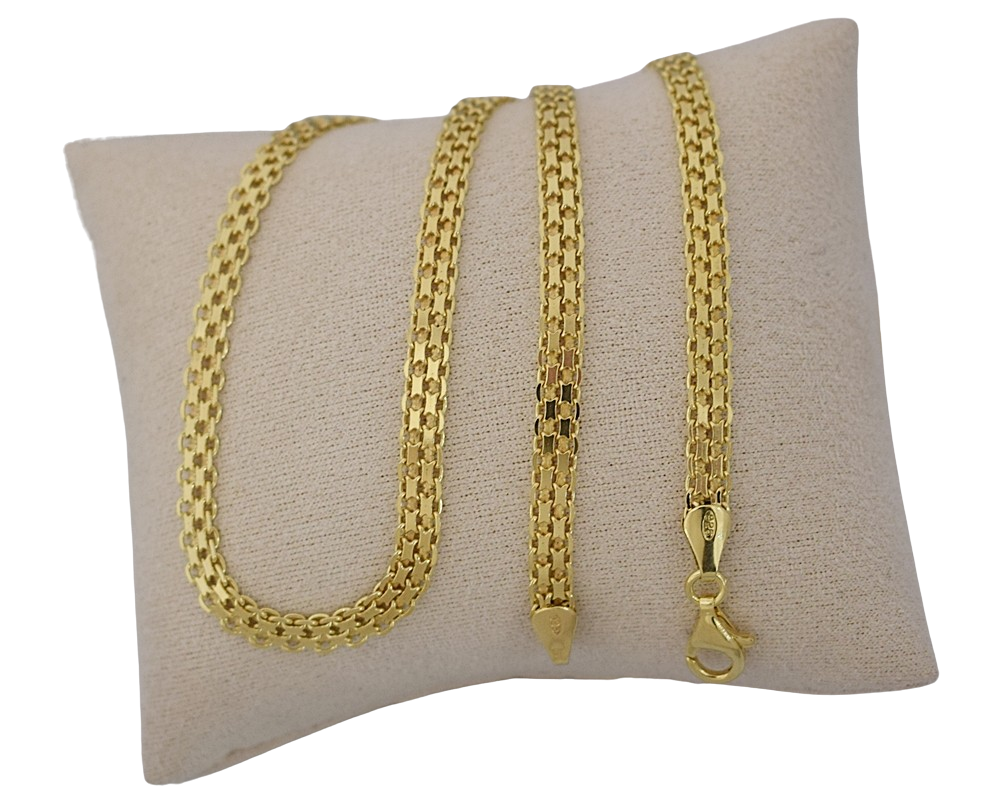 Model o charakterystycznym splocie Bismark wyróżnia się gęsto połączonymi ogniwami, które tworzą elegancką i wyrazistą strukturę. Dzięki swojej zwartej budowie splot ten jest niezwykle trwały, a jednocześnie prezentuje się bardzo stylowo i luksusowo. Łańcuszek pięknie odbija światło oraz doskonale układa się na szyi, podkreślając klasyczny i ponadczasowy charakter biżuterii.