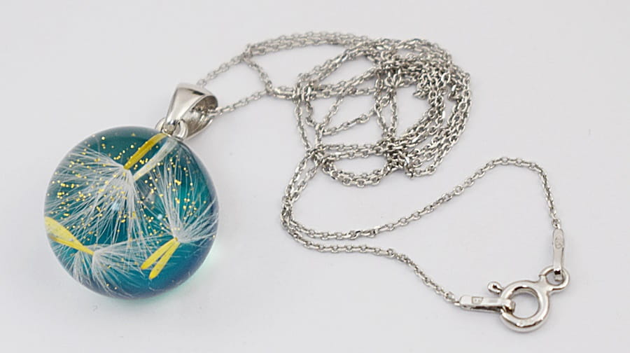 Wyjątkowy wisiorek wykonany w całości ręcznie z najwyższej jakości żywicy (odpornej UV) w której na zawsze zostały zatopione nasiona dmuchawca i złoty pył. Unikatowa biżuteria to idealny prezenta dla wyjątkowej osoby. Łańcuszek srebrny pr 925 Rodowany
