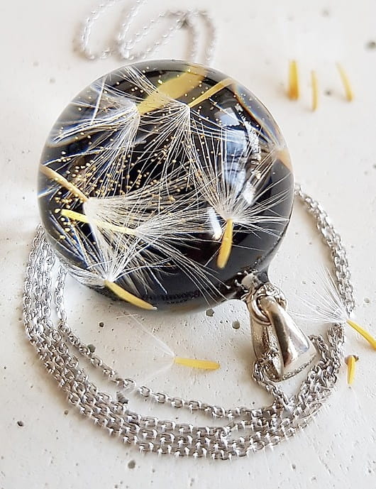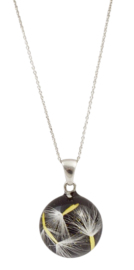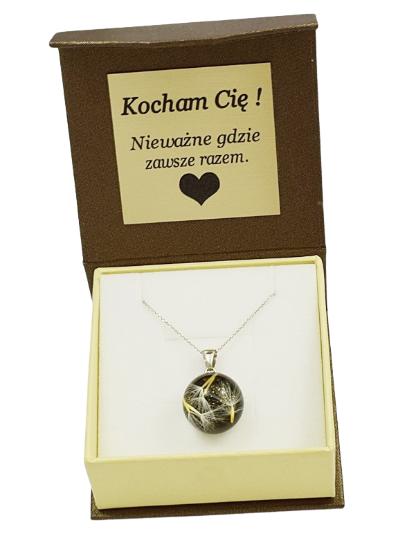 Wyjątkowy wisiorek wykonany w całości ręcznie z najwyższej jakości żywicy (odpornej UV) w której na zawsze zostały zatopione nasiona dmuchawca i złoty pył. Unikatowa biżuteria to idealny prezenta dla wyjątkowej osoby. Łańcuszek srebrny pr 925 Rodowany
