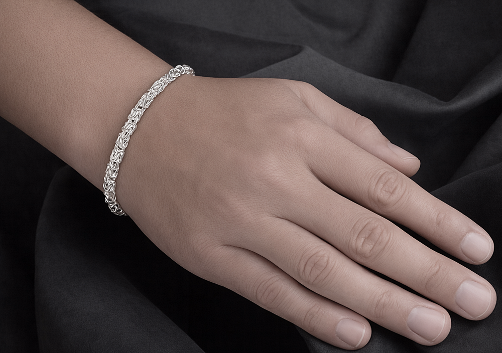 Stylowa i efektowna bransoletka wykonana z wysokiej jakości srebra próby 925, wyróżniająca się wyjątkowym splotem królewskim (byzantyjskim). To jeden z najbardziej eleganckich i trwałych splotów, ceniony za swoją gęstą, przestrzenną strukturę oraz luksusowy wygląd.