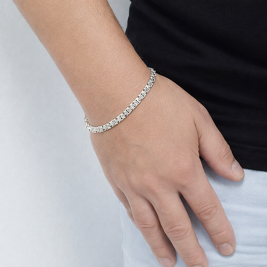 Bransoletka jest masywna, solidna i komfortowa w noszeniu, a jednocześnie pięknie układa się na nadgarstku. Wysoki połysk podkreśla naturalny blask srebra, a bezpieczne zapięcie typu karabińczyk zapewnia wygodę i pewność użytkowania na co dzień.