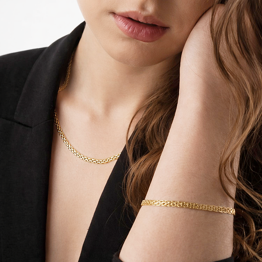 Elegancka damska bransoletka o splocie Bismark wykonana ze srebra próby 925 i pokryta warstwą złota, która nadaje biżuterii pięknego, luksusowego połysku. Splot Bismarck wyróżnia się gęsto połączonymi ogniwami tworzącymi efektowną i solidną strukturę, dzięki czemu bransoletka prezentuje się bardzo stylowo i elegancko.