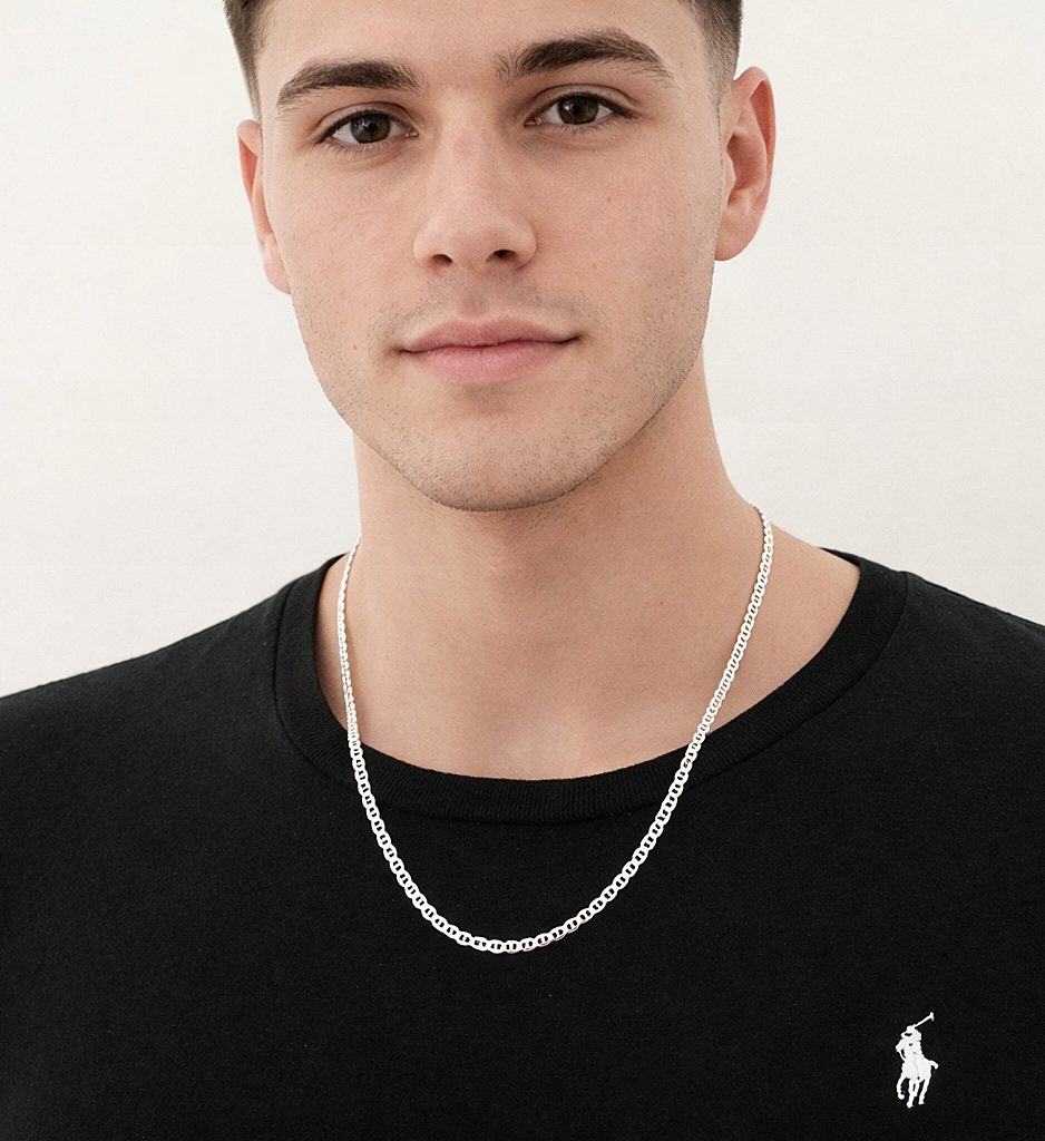 Elegancki i masywny męski łańcuszek srebrny typu Gucci, wykonany w stylu pełnym, diamentowanym, który pięknie odbija światło i przyciąga wzrok. Idealny dodatek dla mężczyzn ceniących styl, klasę i wyraziste dodatki.