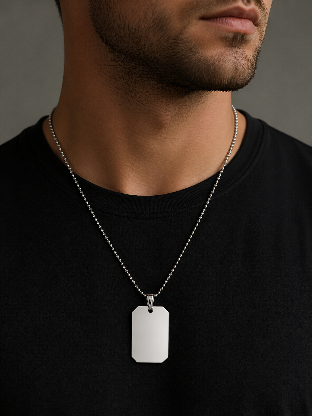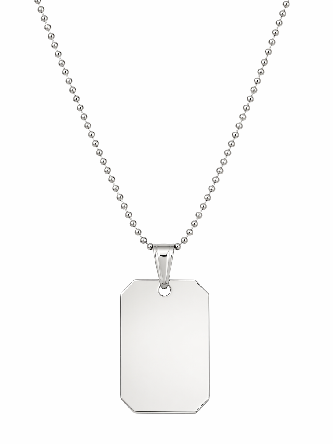 To minimalistyczny łańcuszek kulkowy z zawieszką w formie nieśmiertelnika. Wykonany ze srebra pr 925, ma gładką, błyszczącą powierzchnię i prostą, geometryczną formę, co nadaje mu nowoczesny i uniwersalny charakter. Nieśmiertelnik jest płaski, z lekko ściętymi rogami — idealny do grawerowania lub noszenia w czystej, surowej formie.