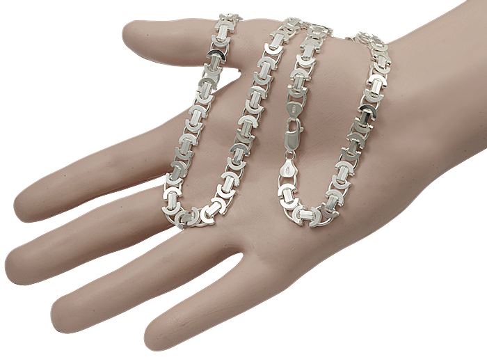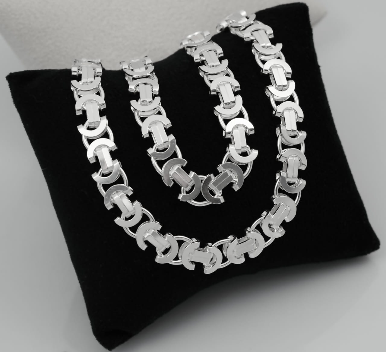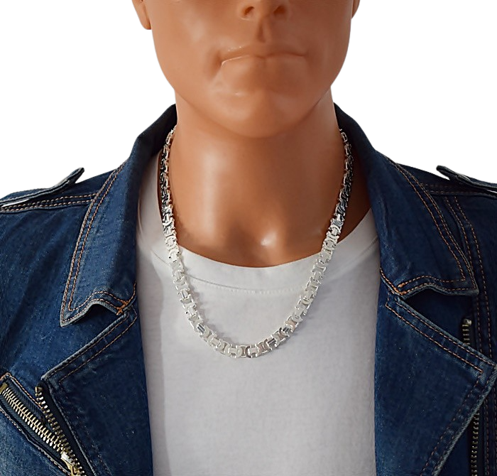 Elegancki, solidny i wyjątkowo efektowny – ten męski łańcuszek o splocie królewskim (royal chain) został wykonany z najwyższej jakości pełnego srebra próby 925. Charakteryzuje się szerokością 8,50 mm, dzięki czemu prezentuje się masywnie, a jednocześnie pozostaje wygodny w codziennym noszeniu.