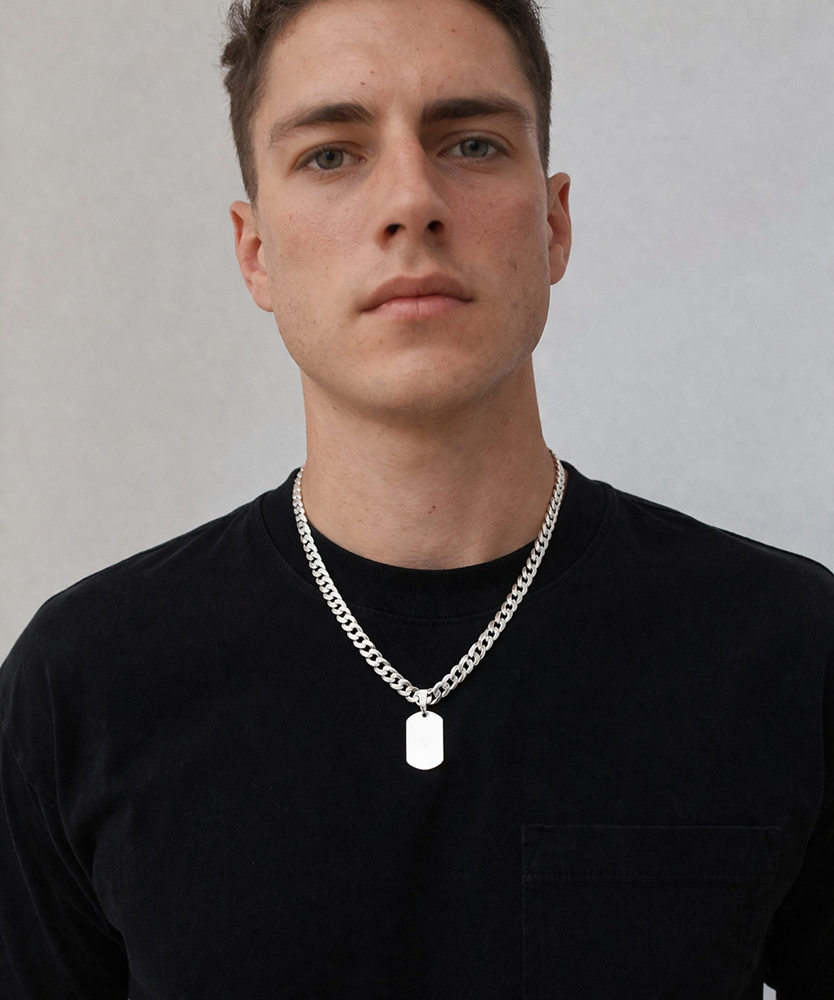 Mocny, wyrazisty naszyjnik wykonany w klasycznym splocie pancerki o szerokości 9,20 mm . Uzupełniony gładkim, minimalistycznym nieśmiertelnikiem, który nadaje całości nowoczesnego charakteru. Ta biżuteria zdecydowanie wyróżnia się na tle codziennych dodatków.