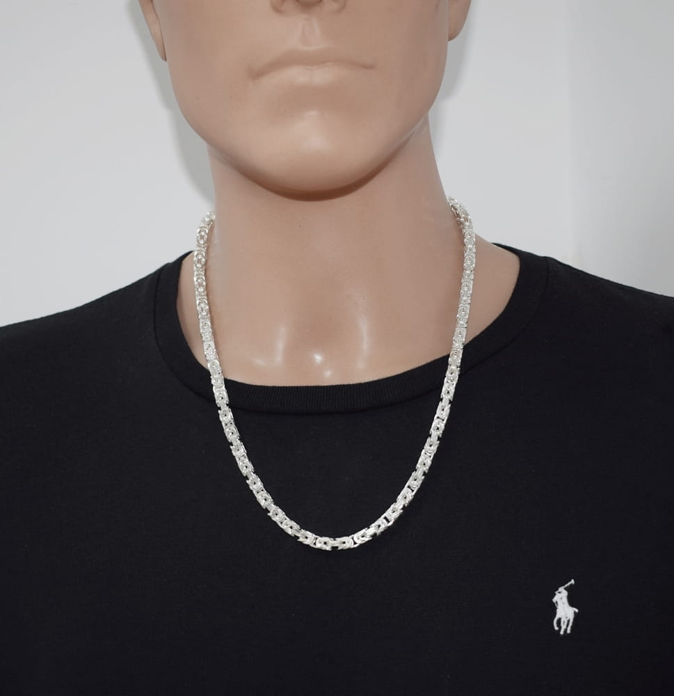 Ten masywny łańcuszek srebrny o splocie królewskim (bizantyjskim) to symbol siły, elegancji i pewności siebie. Wykonany z pełnego srebra próby 925, ma solidną konstrukcję, która doskonale układa się na szyi i przyciąga uwagę swoim blaskiem.