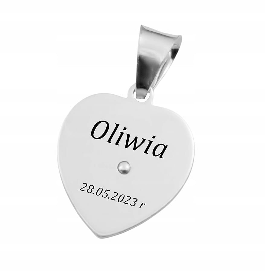 Na tylnej części zawieszki możemy wygrawerować każdy nadesłany przez Państwa tekst np. imię i nazwisko, data, grupa krwi itp. maksymalnie do 20 znaków