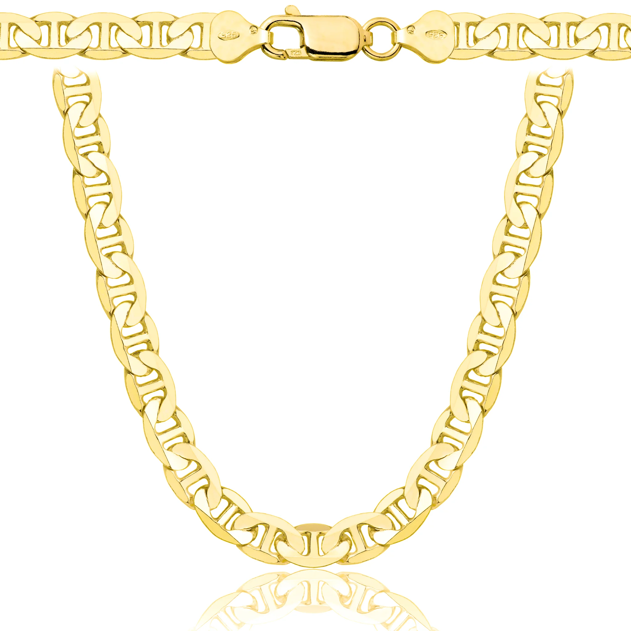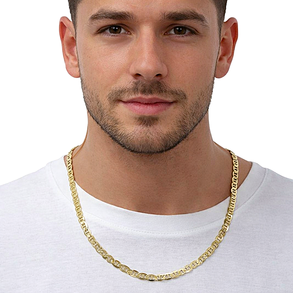 Elegancki łańcuszek typu Gucci o szerokości 6,50 mm, wykonany ze srebra próby 925 i pokryty warstwą złota. Charakteryzuje się nowoczesnym, geometrycznym splotem, który nadaje mu wyjątkowego charakteru i subtelnego blasku. Idealny dla mężczyzn ceniących styl i ponadczasową elegancję – świetnie komponuje się zarówno z codziennym, jak i bardziej dopracowanym outfitem.