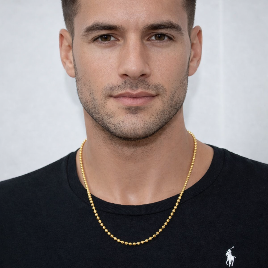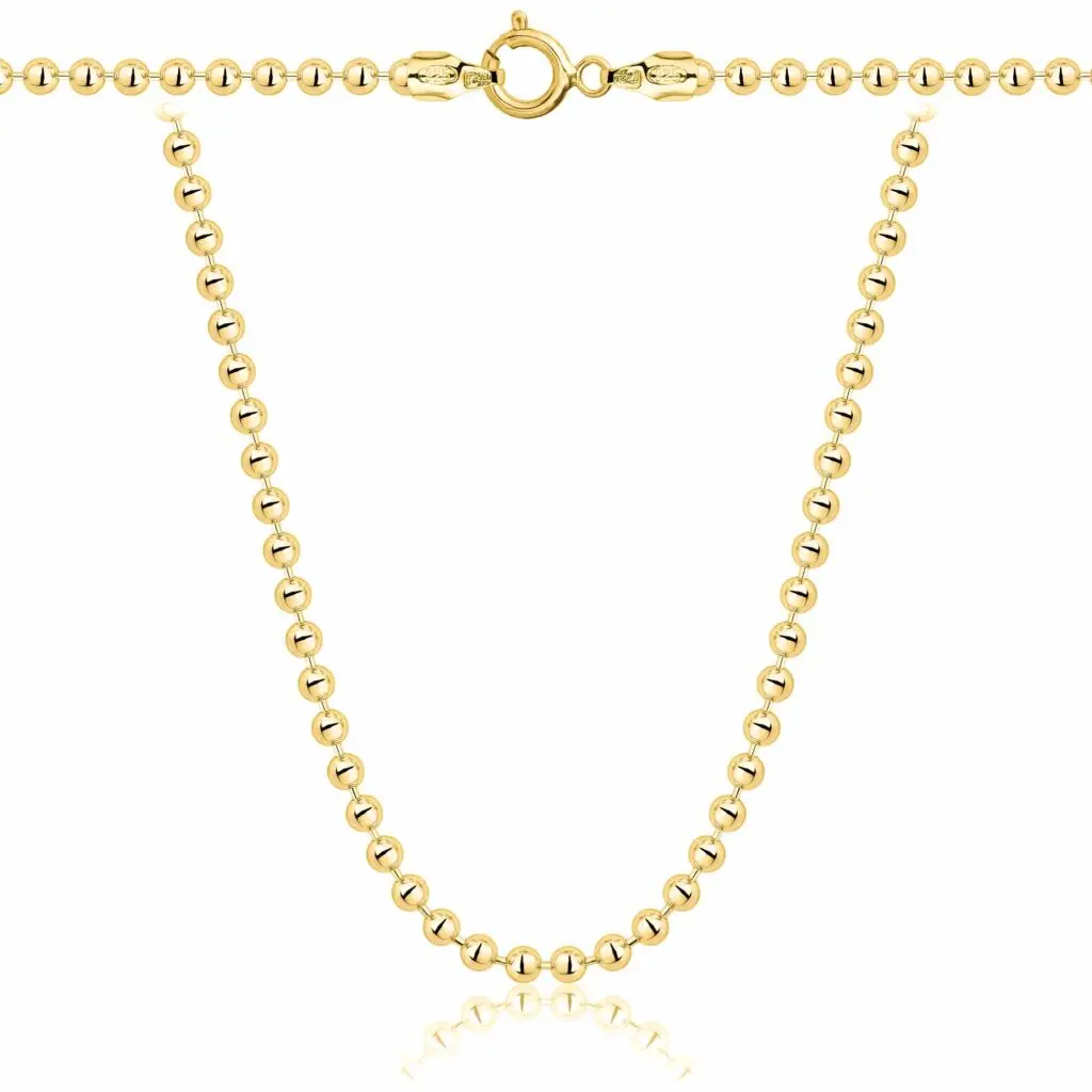 Subtelny łańcuszek kulkowy o szerokości 3,10 mm, wykonany ze srebra próby 925 i pokryty warstwą złota. Składa się z równomiernie rozmieszczonych, połyskujących kulek, które nadają mu nowoczesny i minimalistyczny charakter. Najczęściej wybierany do noszenia z nieśmiertelnikami, jednak świetnie prezentuje się również samodzielnie jako delikatna, stylowa ozdoba.