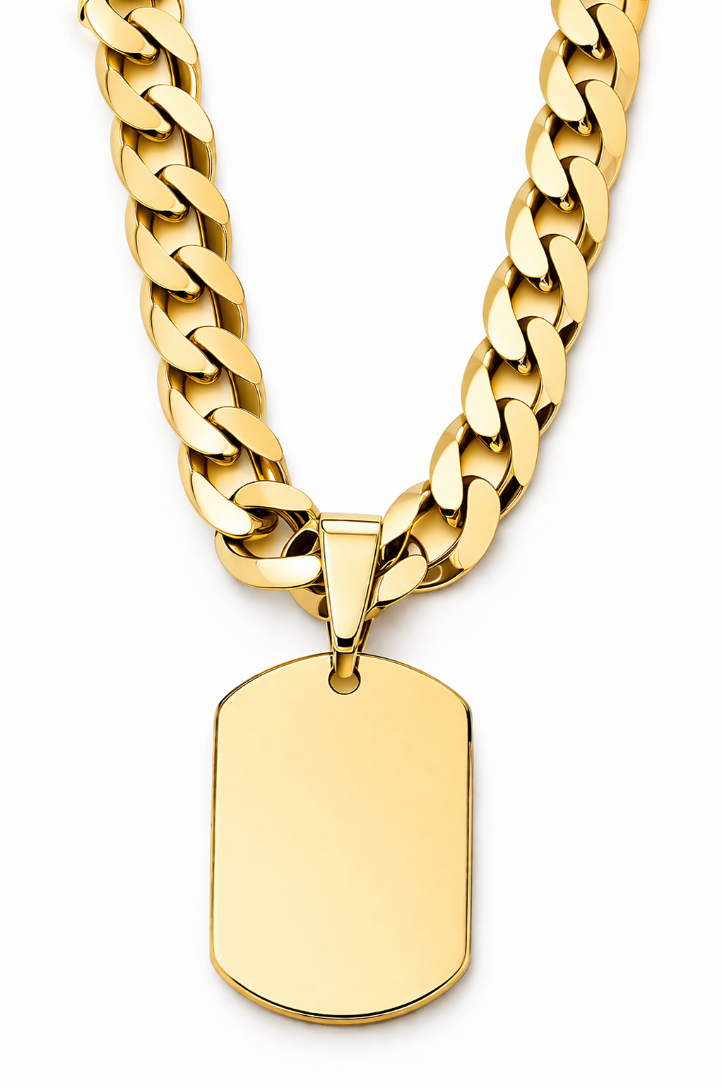 Mocny, wyrazisty naszyjnik wykonany w klasycznym splocie pancerki o szerokości 9,20 mm . Uzupełniony gładkim, minimalistycznym nieśmiertelnikiem, który nadaje całości nowoczesnego charakteru. Pozłacane wykończenie podkreśla elegancję i sprawia, że biżuteria wyróżnia się na tle codziennych dodatków.