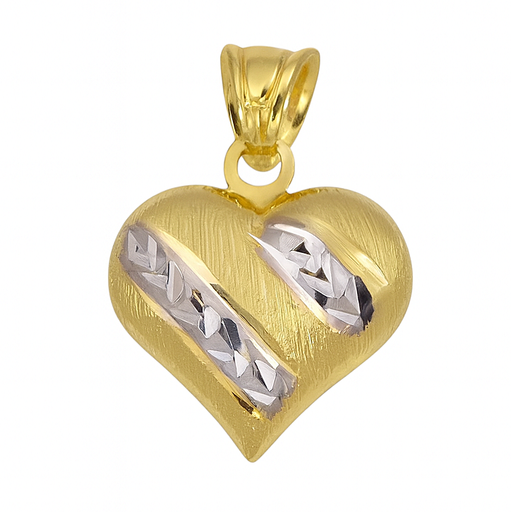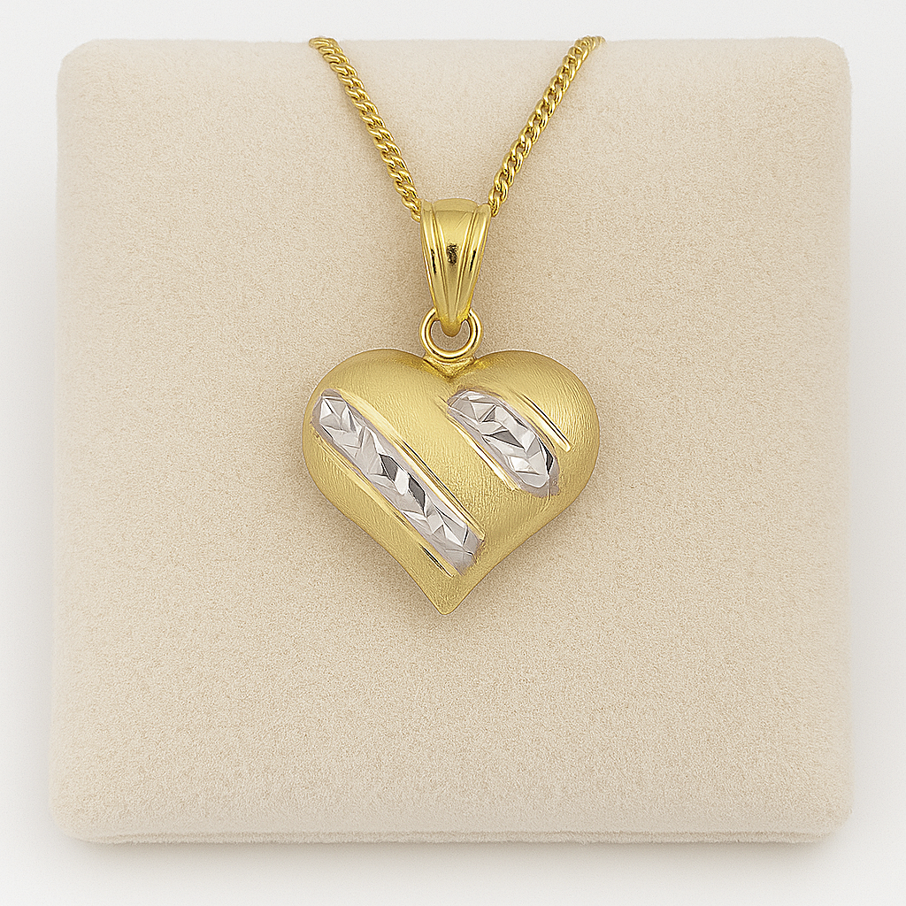 Elegancka zawieszka w kształcie serduszka wykonana ze złota próby 585. Biżuteria łączy w sobie klasyczny urok złota z nowoczesnym akcentem – ozdobnymi, diamentowanymi wstawkami w kolorze białego złota, które pięknie odbijają światło i nadają całości wyjątkowego blasku.
