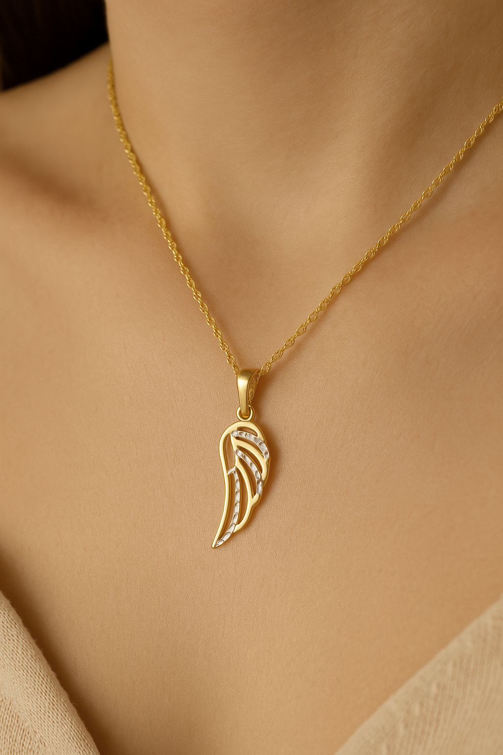 Wyjątkowa złota zawieszka skrzydło anioła wykonana z połączenia żółtego i białego złota to symbol ochrony, bezpieczeństwa i duchowego wsparcia. Jej nowoczesny, a zarazem elegancki charakter sprawia, że doskonale komponuje się z różnymi stylizacjami. Starannie dopracowane detale i wysoka jakość wykonania gwarantują trwałość oraz piękno na lata. To biżuteria pełna znaczenia, która sprawdzi się zarówno na co dzień, jak i podczas wyjątkowych okazji. Idealna również jako prezent z głęboką symboliką.