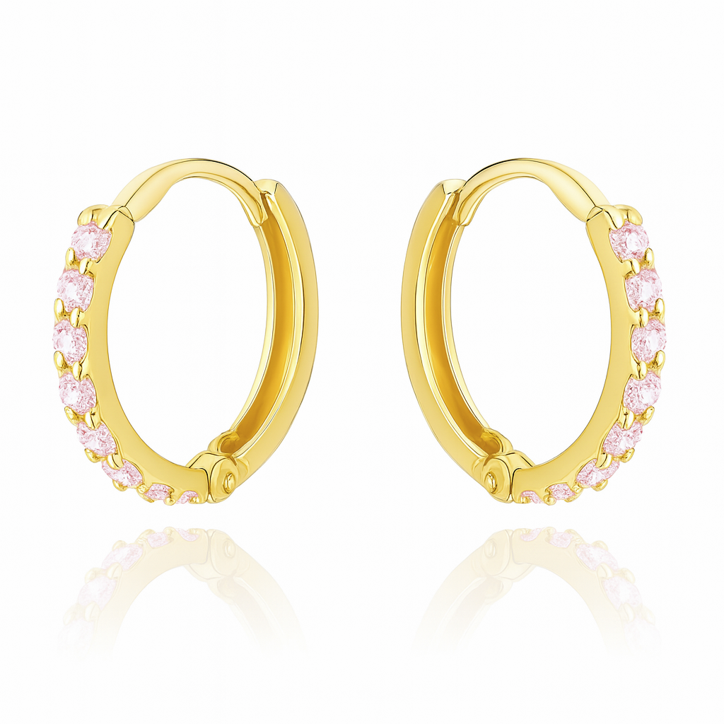 Eleganckie, klasyczne kolczyki koła wykonane ze złota próby 585 to biżuteria, która zachwyca subtelnym połyskiem i kobiecym akcentem. Front kolczyków został ozdobiony lśniącymi różowymi cyrkoniami, które pięknie odbijają światło, dodając całości wyjątkowego blasku.