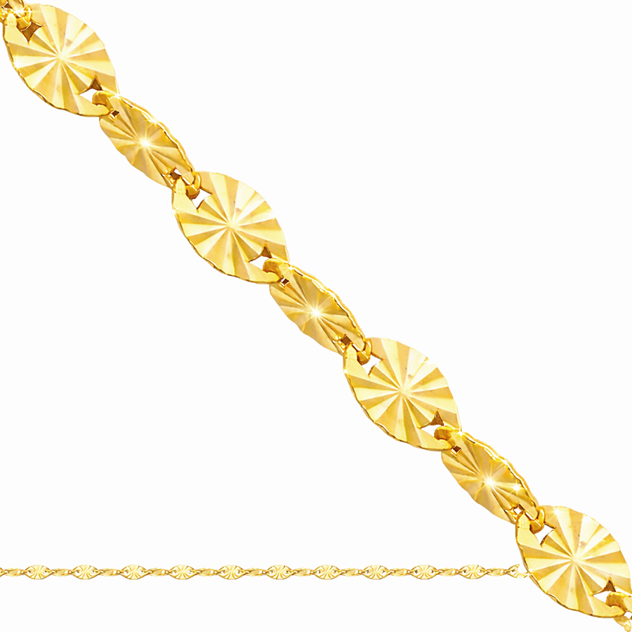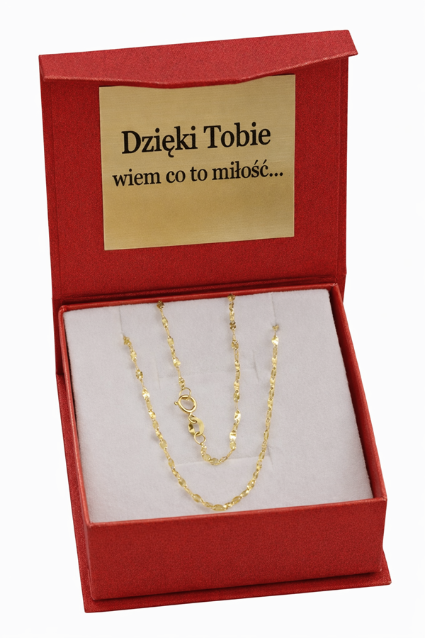 Elegancki i efektowny złoty łańcuszek wykonany z prawdziwego złota próby 585 (14K). Wyjątkowy wzór z dekoracyjnymi błyszczącymi blaszkami o diamentowanym szlifie pięknie odbija światło i nadaje biżuterii luksusowy połysk.