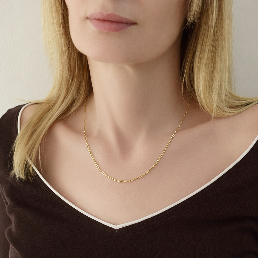 Złoty łańcuszek próby 585 (14 karatów) wykonany ze szlachetnego złota o pięknym, intensywnym kolorze. Model ten charakteryzuje się modnym splotem ankier z wydłużonymi ogniwami, który doskonale komponuje się zarówno z zawieszkami, jak i noszony samodzielnie