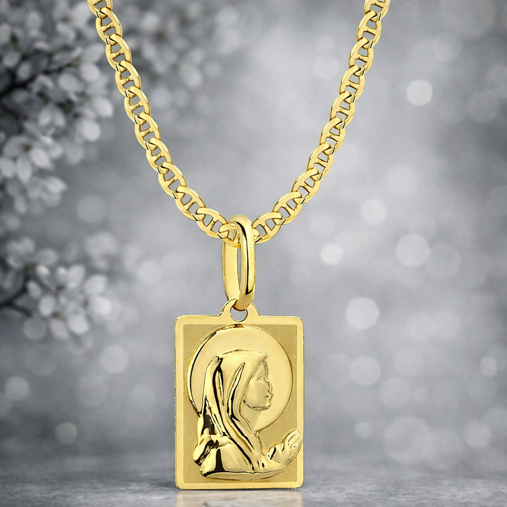 Oferujemy wyjątkowy komplet biżuterii – pełny złoty łańcuszek splot Gucci o szerokości 2,00 mm z dołączonym medalikiem. To idealny wybór na prezent z okazji Chrztu, Komunii, Bierzmowania, a także jako subtelna ozdoba na co dzień.