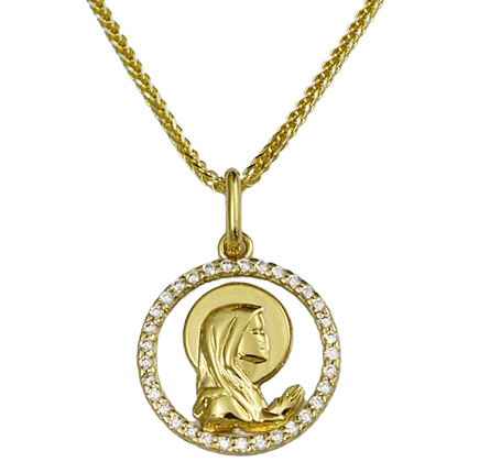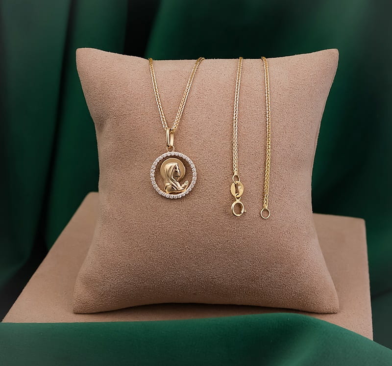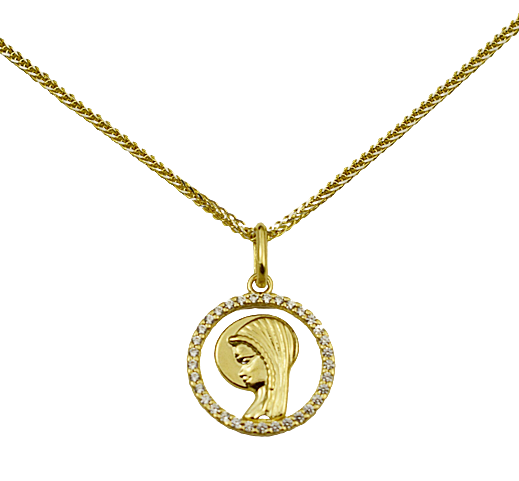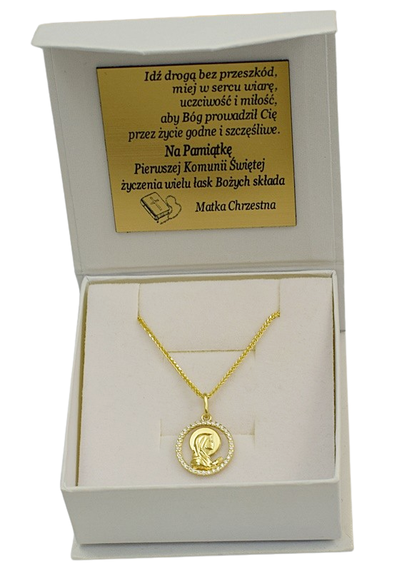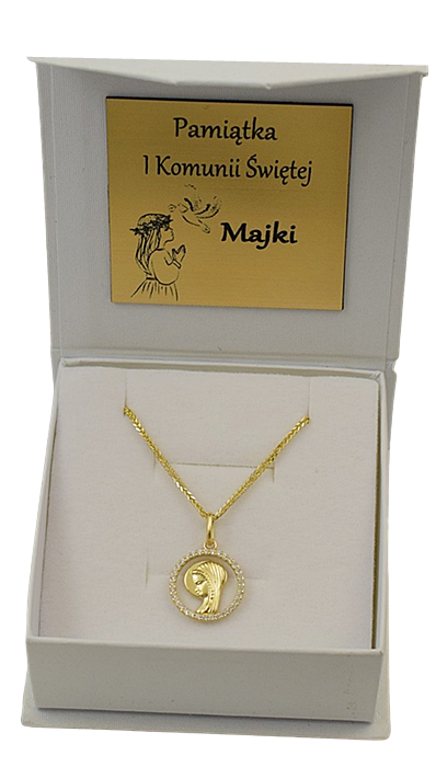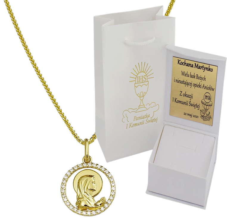 Złoty niezwykle piękny zestaw komplet łańcuszek z medalikiem z wysadzanymi cyrkoniami