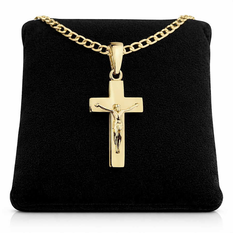 Krzyżyk o klasycznym wzorze z wizerunkiem Chrystusa stanowi ponadczasowy symbol wiary i stylu. Całość doskonale sprawdzi się zarówno jako biżuteria codzienna, jak i elegancki dodatek na wyjątkowe okazje.