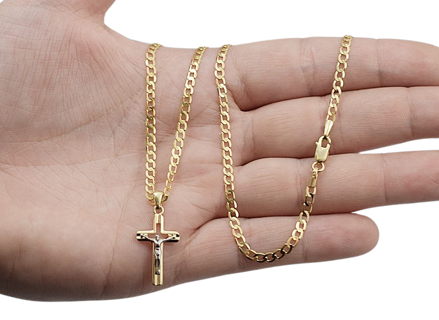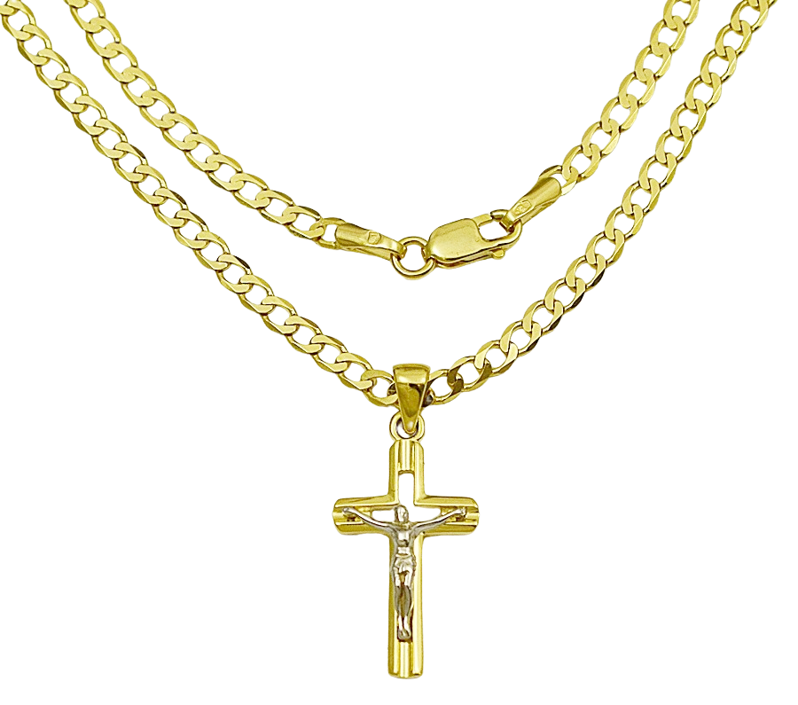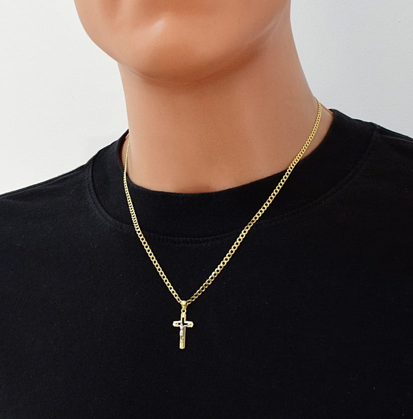 Elegancki złoty łańcuszek pełny diamentowany wykonany z wysokiej jakości złota próby 585 (14K), ozdobiony klasycznym krzyżykiem z subtelną pasyjką z białego złota. Połączenie dwóch kolorów złota nadaje biżuterii wyjątkowego charakteru i podkreśla detale postaci Chrystusa.