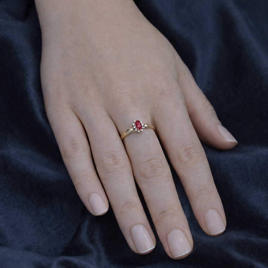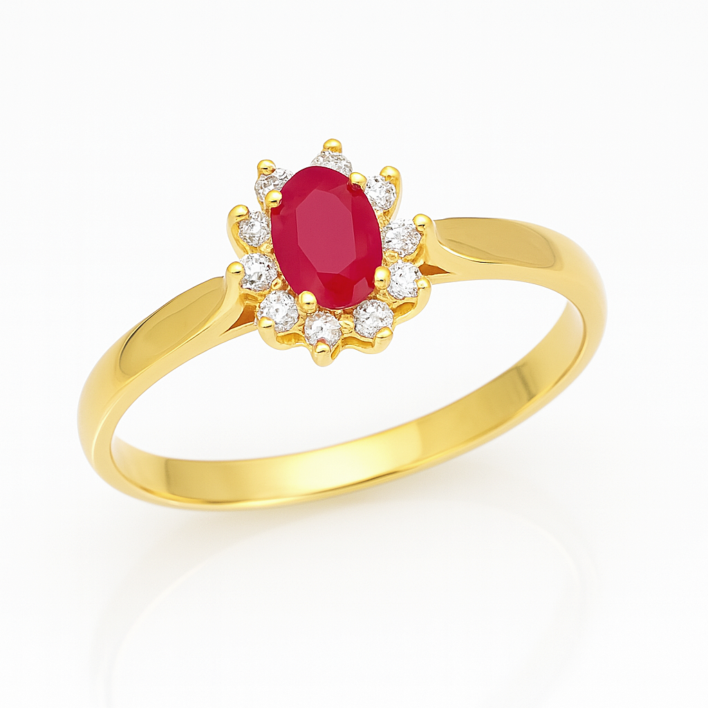 Złoty pierścionek wykonany z klasycznego, żółtego złota prezentuje centralnie osadzony, owalny rubin w głębokim, malinowym odcieniu. Kamień główny otacza delikatna aureola drobnych, lśniących diamentów, które dodają biżuterii blasku i podkreślają intensywną barwę rubinu. Smukła, gładka obrączka subtelnie dopełnia całość, tworząc harmonijną i ponadczasową kompozycję. To elegancki i wyrafinowany pierścionek, idealny dla osób ceniących klasykę oraz luksusowe, szlachetne detale